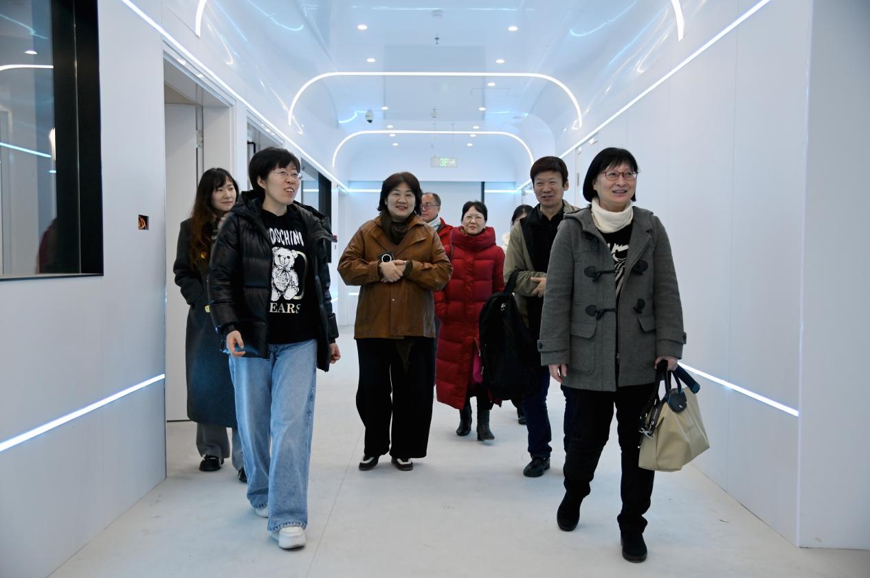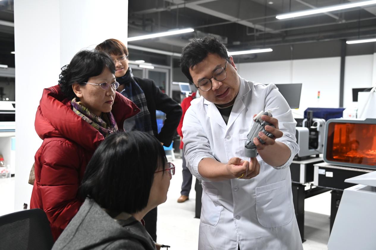 随后,参访团前往实验三号楼,在充满科技感的展厅内驻足参观,并集中观看了中心宣传影片。这座配备跨尺度生物力学检测、生物材料制备等国际一流设施的实验楼,让参访团直观感受到中心在科研空间打造上的匠心与实力。王丽珍主任以实验楼规划为核心,详细拆解了中心围绕 “基础研究 - 技术实现 - 产业转化” 全链条的搭建思路 —— 从实验室里的原始创新,到技术实现中的瓶颈突破,再到产业转化中的落地赋能,全流程支撑医工交叉领域的科研创新与成果落地。同时,她还简要介绍了楼内重点实验室的规划布局,生物制造、智能康复、生物力学等核心领域的多元布局,生动展现了中心多学科交叉融合的科研架构。